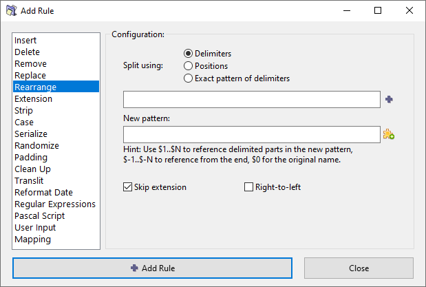 For example, take filename "Artist - Title" and to swap it around one would use " - " as a delimiter and "$2 - $1" as a new pattern which will result in "Title - Artist". However, if some filename appears with more dashes like "Artist - Title - Album" the result will also be "Title - Artist" and the trailing part "Album" will be discarded. To avoid silently discarding parts of the filename, consider using the Exact pattern of delimiters option instead.