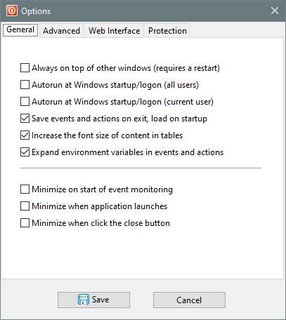 - Stop event monitoring on hibernation/sleep — Automatically stop event monitoring when computer goes into hibernation/sleep mode. This option can be useful when you use timing events (e.g. Countdown and User Inactive) which can sometimes trigger immediately after waking up from a prolong suspended state.